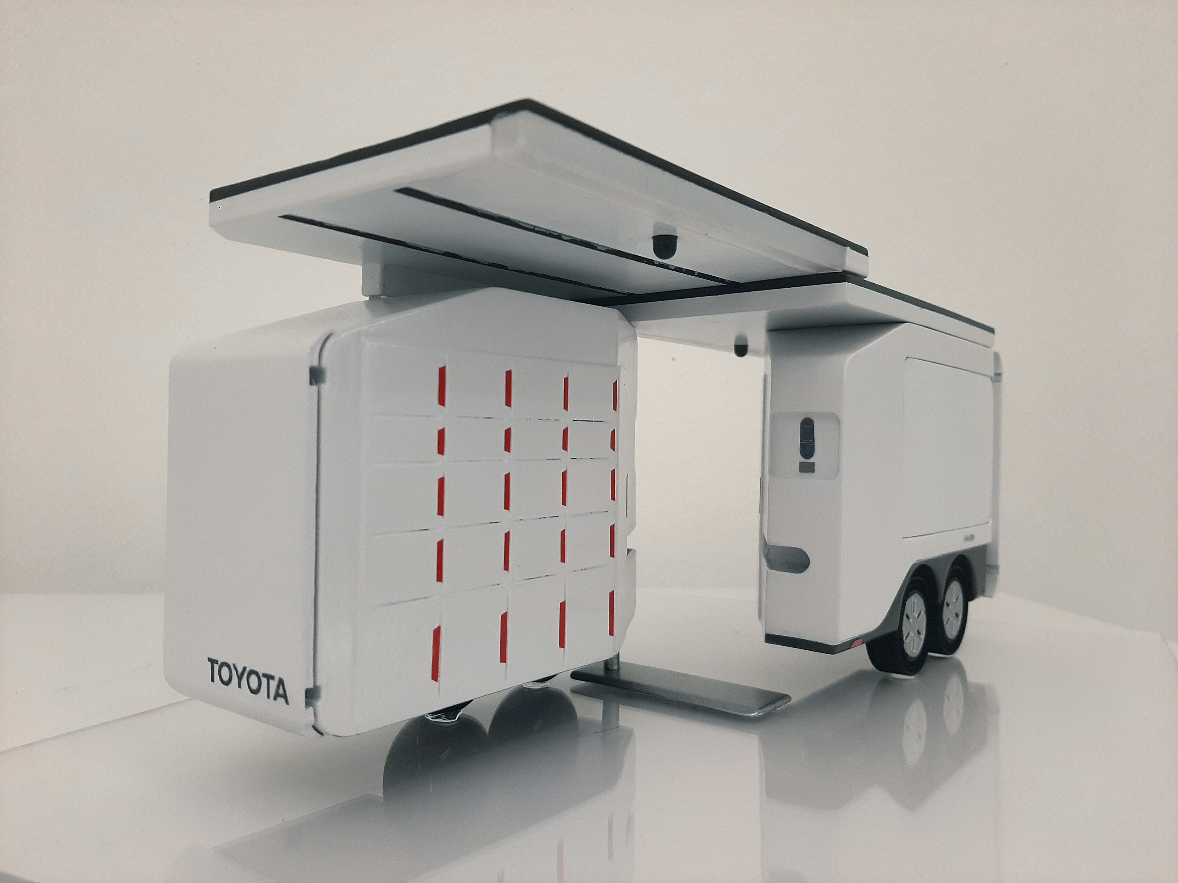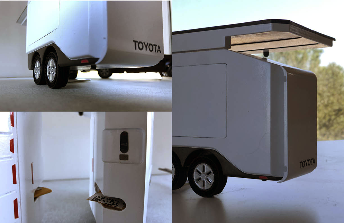 We 3d printed our scale model and spray painted it. We used transfer paper to make our graphics, and we printed our headlights then glued them to thin plastic. Our model was 1:24th scale.