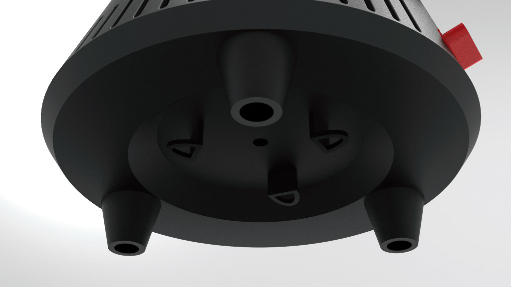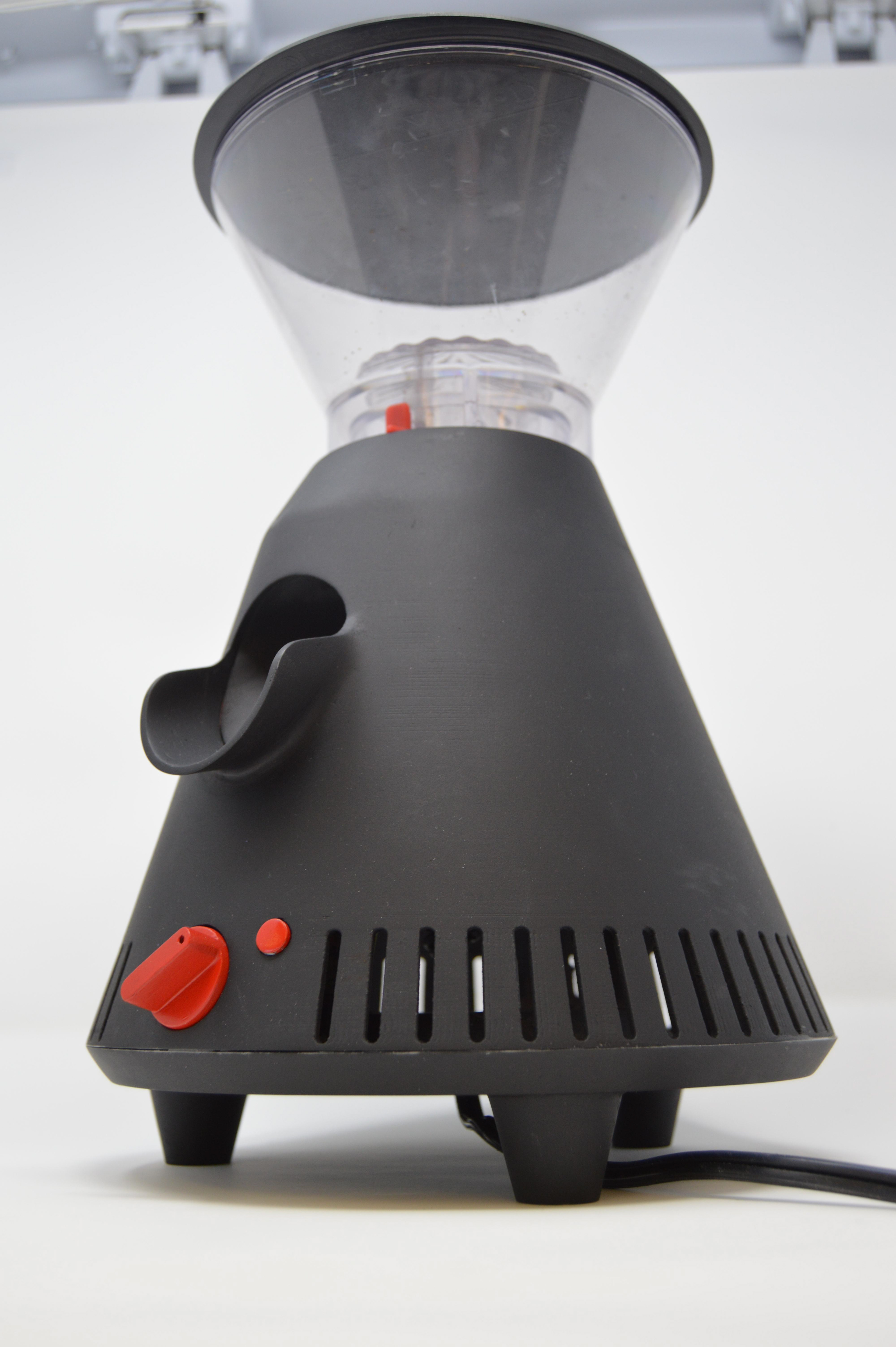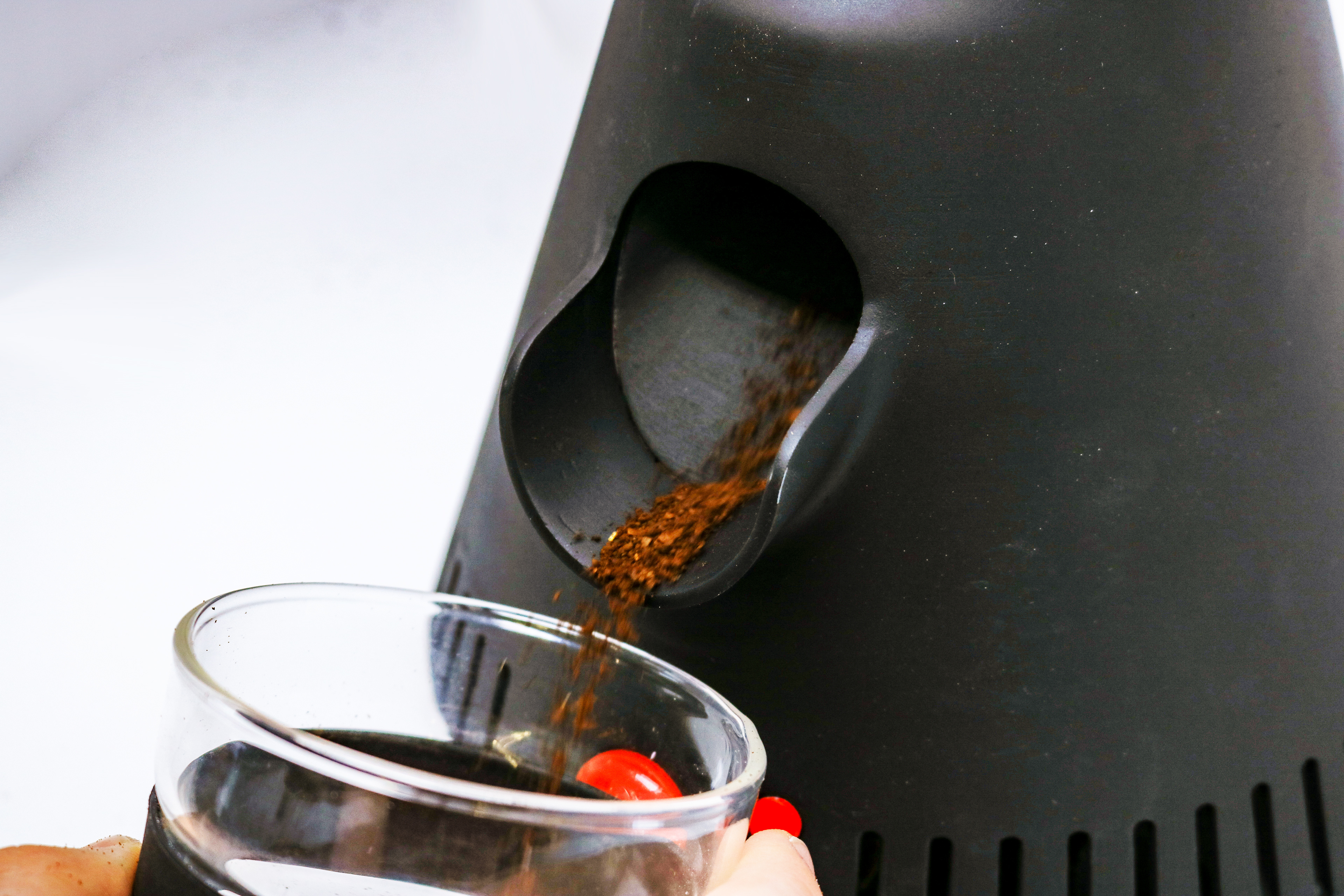 Peak uses a conical burr to grind coffee. The spout allows you to chose your receptacle. Large vents at the bottom cool the mechanism, which helps preserve the flavor.